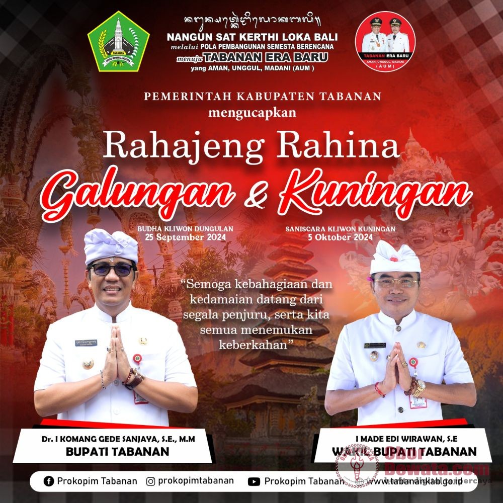 “Saya, I Komang Gede Sanjaya, Bupati Tabanan atas nama Pemerintah Kabupaten Tabanan, mengucapkan selamat Hari Raya Galungan dan Kuningan kepada seluruh umat swdharma dimanapun berada. Semoga Kebahagiaan dan Kedamaian datang dari segala penjuru, serta kita semua menemukan keberkahan,” ujar Sanjaya.