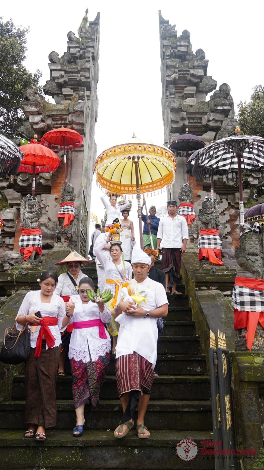 Nampak istri dari Wagub Bali, Ny. Tjok. Putri Hariyani Ardhana Sukawati dan putra pertamanya turut serta mengikuti prosesi mapepada wewalungan yang mengitari pura Mandara Giri Semeru Agung sebanyak tiga (3) kali.