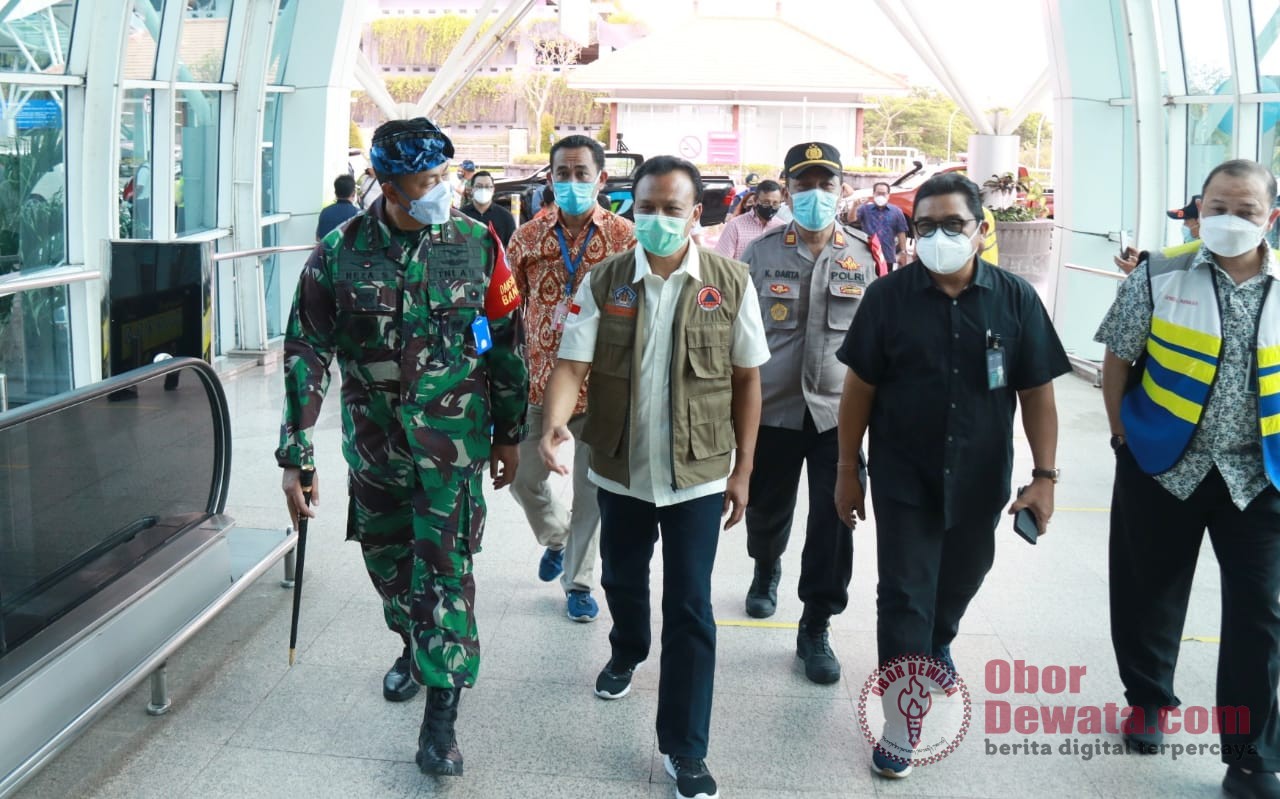 BADUNG, OborDewata.com – Sekretaris Daerah yang juga selaku Ketua Harian Ketua Harian Gugus Tugas Percepatan Penanganan Covid-19 Provinsi Bali Dewa Made Indra memantau pelaksanaan simulasi penerimaan penumpang dari luar negeri yang berlangsung di terminal kedatangan internasional Bandara Internasional I Gusti Ngurah Rai, Sabtu (9/10/2021). Simulasi ini sebagai bagian dari persiapan pembukaan Bali untuk wisatawan manca negara mulai tanggal 14 Oktober 2021 mendatang.