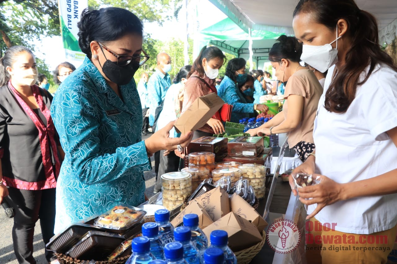 DENPASAR, OborDewata.com – Ketua TP PKK Provinsi Bali Ny Putri Suastini Koster didampingi Ketua Dharma Wanita Persatuan Provinsi Bali Ny Widiasmini Indra dan Kepala Dinas Koperasi dan UKM Provinsi Bali, I Wayan Mardiana mengunjungi kegiatan pasar rakyat menyambut Hari Raya Galungan dan Kuningan yang digelar di Jalan Basuki Rahmat (depan Kantor Gubernur Bali), Jumat (5/11/2021).
