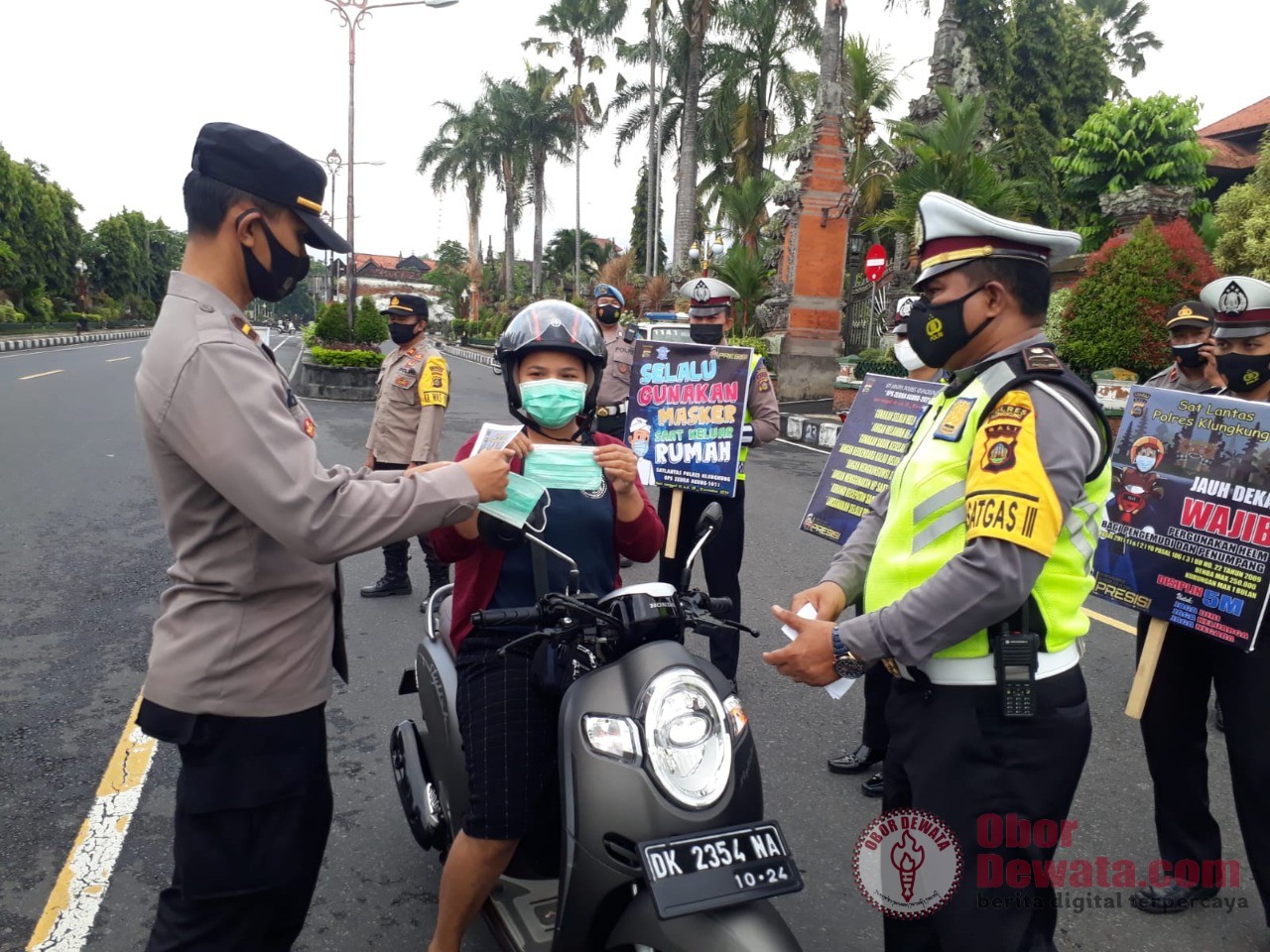 SEMARAPURA, OborDewata.com – Polda Bali,Polres Klungkung menggelar Operasi Zebra Agung- 2021. Adapun Operasi Zebra yang digelar di masa pandemi Covid-19 ini sejumlah personel yang bertugas mengimbau pengendara untuk taat lalu lintas, protokol kesehatan (prokes), memberikan masker, dan menempelkan stiker,Jumat (19/11/2021).