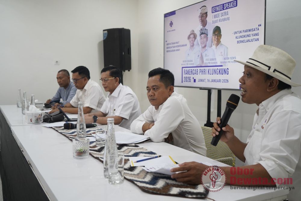 KLUNGKUNG, OborDewata.com – Bupati Klungkung I Made Satria secara resmi membuka Rapat Kerja Cabang (Rakercab) II Perhimpunan Hotel dan Restoran Indonesia (PHRI) Kabupaten Klungkung Tahun 2026 yang digelar di Caspla Beach Club, Nusa Penida, Jumat (16/1/2026).