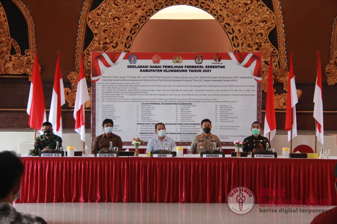 SEMARAPURA, OborDewata.com – Polda Bali- Polres Klungkung Untuk menciptakan Pemilihan Perbekel (Pilkel) yang aman dan damai. seluruh calon perbekel menggelar deklarasi damai. Deklarasi Damai pemilihan Perbekel serentak di Kabupaten Klungkung tahun 2021 di gagas oleh Polres Klungkung bertempat di Aula Jalaga Dharma Pandhapa, Sabtu (16/10/2021)