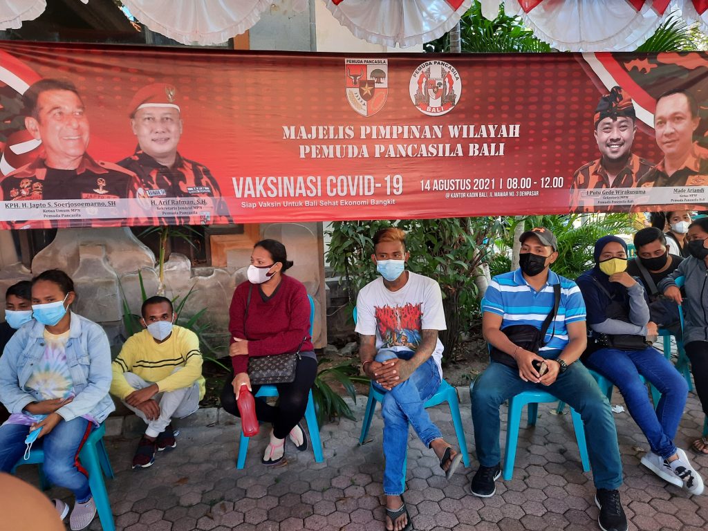 Usai memberikan keterangan persnya, WKU III Kadin Indonesia Bidang Kelautan dan Perikanan, Joseph Pangalila bersama Ketua Kadin Bali dan jajarannya meninjau langsung pelaksanaan program vaksinisasi tahap II, bahkan dalam proses pelaksanaan vaksinisasi melibatkan para Srikandi Pemuda Pancasila. dx