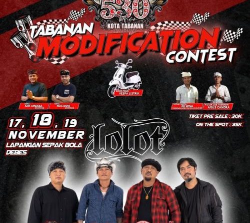 TABANAN, OborDewata.com – Serangkaian memeriahkan perayaan HUT Kota Tabanan ke-530 Tahun 2023, Pemerintah Kabupaten Tabanan menggelar event bertajuk “Tabanan Modifocation Contest” yang diselenggarakan selama 3 hari mulai tanggal 17-19 Nopember 2023 di lapangan Sepak Bola Debes, Gerokgak, Tabanan.