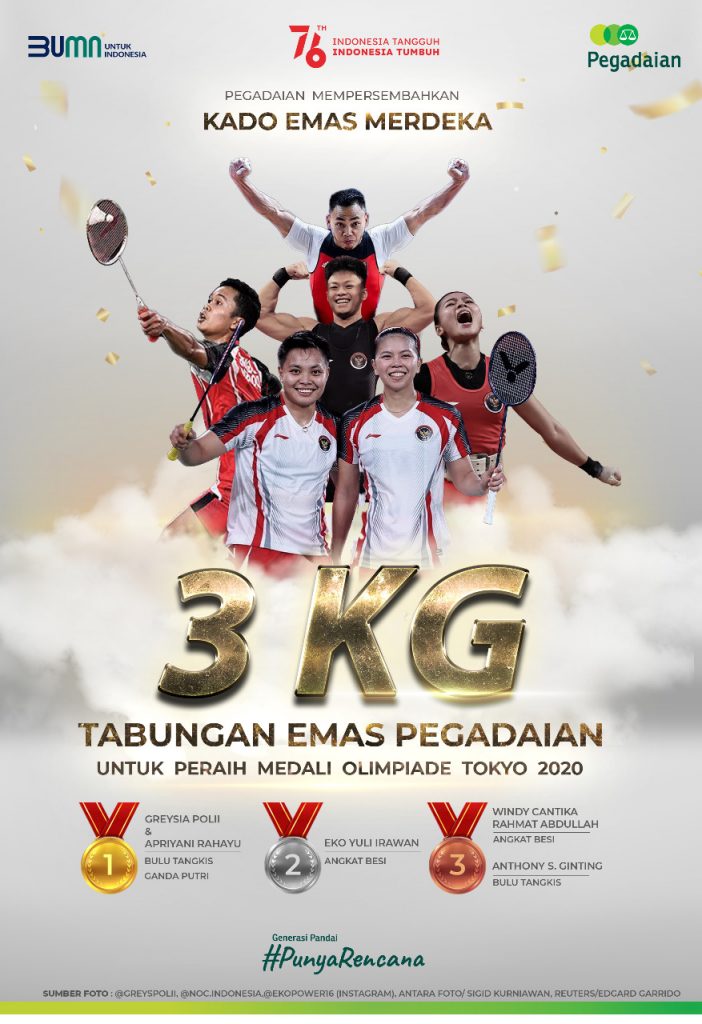 JAKARTA, OborDewata.com – PT Pegadaian (Persero) memberikan apresiasi kepada para atlet yang berprestasi dengan guyuran tabungan emas di ajang Olimpiade Tokyo 2020. Total hadiah seberat 3 kg yang akan diberikan setelah mereka kembali ke tanah air. Direktur Utama PT Pegadaian (Persero) Kuswiyoto menyampaikan bahwa seluruh Insan Pegadaian ikut bersyukur dan berbangga atas prestasi para atlet yang mengharumkan nama bangsa di ajang olah raga internasional tersebut.