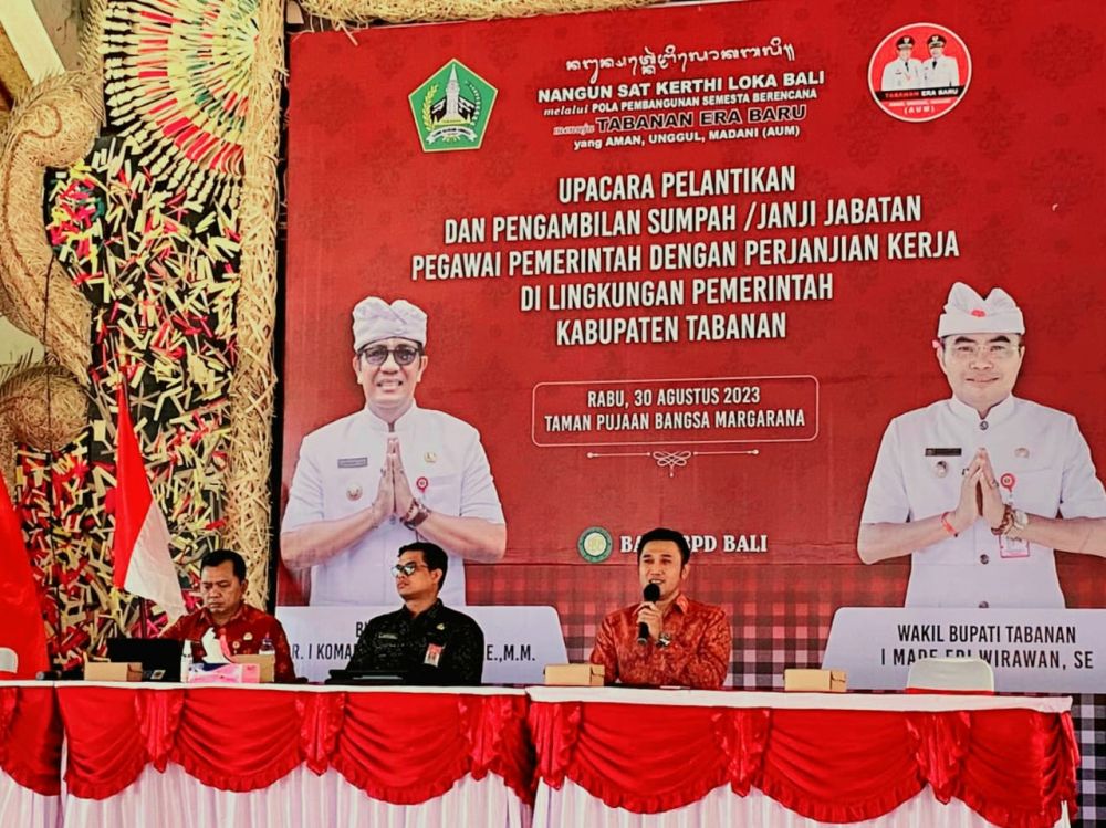 TABANAN, OborDewata.com – Untuk meningkatkan kualitas pendidikan di Kabupaten Tabanan khususnya pada tenaga pengajar, Kepala Badan BKPSDM, dan kepala dinas pendidikan kabupaten Tabanan bersinergi dengan Bank BPD Bali Kantor Cabang Tabanan untuk andil dalam acara Pembekalan Upacara Pelantikan dan Pengambilan Sumpah/Janji Jabatan Pegawai Pemerintah dengan Perjanjian Kerja di Lingkungan Pemerintah Tabanan, bertempat di Wantilan Taman Pujaan Bangsa Margarana. Kehadirannya tersebut untuk memberikan edukasi kepada 478 pegawai P3K yang baru terdiri dari tenaga pendidik untuk membuka mind set dalam mengelola keuangan yang tepat, sehingga bisa menjadikan guru P3K yang profesional dalam melaksanakan tugas dalam membangun karakter anak di masa transformasi teknologi informasi ini untuk menuju Indonesia emas 2045.