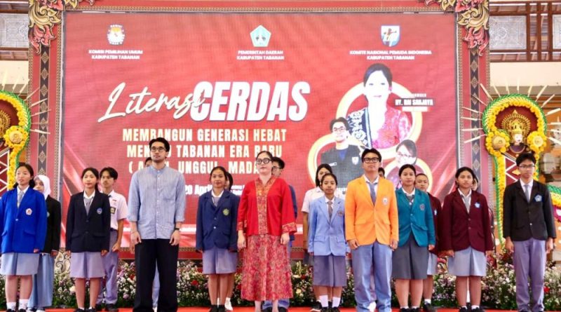 TABANAN, OborDewata.com – Ny. Rai Wahyuni Sanjaya atau yang akrab disapa Bunda Rai resmi mengemban tugas sebagai Bunda Literasi Kabupaten Tabanan periode 2026–2029. Pengukuhan tersebut dilaksanakan dalam rangkaian Festival Literasi di Gedung Kesenian I Ketut Marya Tabanan, Senin (20/4), yang dipadati ratusan siswa dan guru. Prosesi pengukuhan dilakukan oleh Bupati Tabanan yang diwakili Wakil Bupati I Made Dirga, sekaligus menjadi penegasan komitmen daerah dalam membangun kualitas sumber daya manusia berbasis literasi.