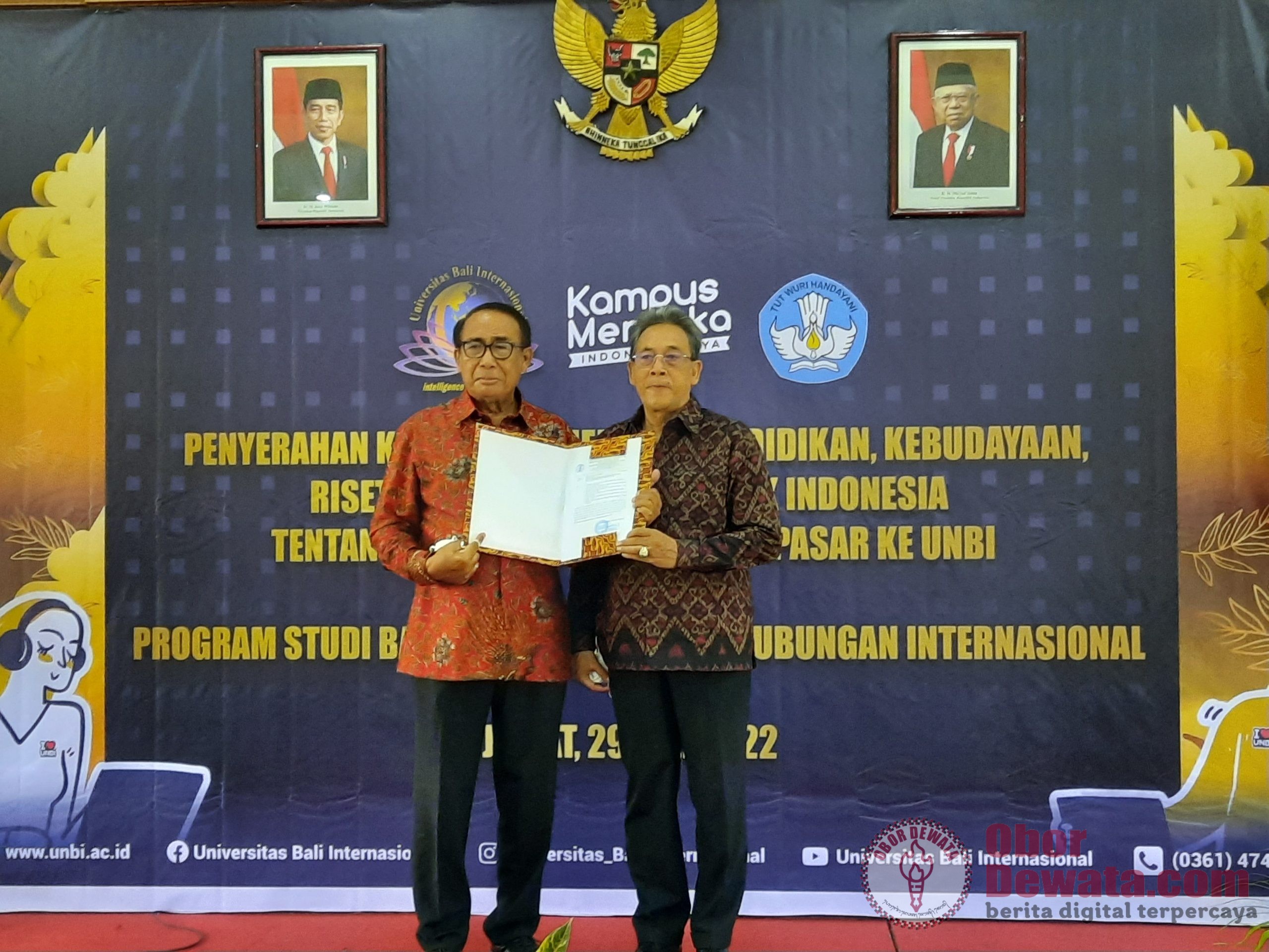 DENPASAR, OborDewata.com – Setelah UNBI berhasil alih kelola STIA Denpasar dengan Keputusan Menteri Pendidikan, Kebudayaan, Riset, dan Teknologi (Mendikbudristek) Nomor 455/E/O/2022 tentang Izin Penyatuan Sekolah Tinggi Ilmu Administrasi (STIA) Denpasar di Kota Denpasar. Ketua Yayasan Anugerah Husada Bali Indonesia Dr. I Nyoman Gede Astina M.Pd.,CHT.,CHA yang menyerahkan Keputusan Menteri Pendidikan, Kebudayaan, Riset, dan Teknologi Republik Indonesia tentang Penyatuan Sekolah Tinggi Ilmu Administrasi (STIA) Denpasar ke Universitas Bali International (UNBI) kepada Rektor UNBI Prof. Dr. dr. I Made Bakta, Sp.PD-KHOM. di Denpasar, Jumat (29/7/2022).